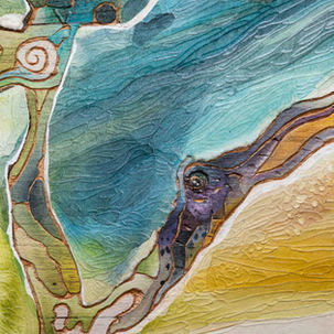 After making the Thin Places Collection that is inspired by the mountains of Europe, I now enter the pathways of the Coral Eden… I always wonder on the intricacies and strength of the coral reef. It begins only with a microscopic polyp that grows into a massive and very sturdy ocean architecture where creatures feed and thrive. It is incomparable even to the most modern skyscraper built by man. Using my little spectacles, I already was able to marvel at the coral community from Nice France to Mykonos Greece and now to my beloved Las Islas Filipinas. The patterns, colors and textures are overwhelming that all I can do is dance along the ink, water and scalpel as I interpret the pathways. It is also with so much joy that I can dance along with my husband S. W. Yoder as he also does his through wood carvings.